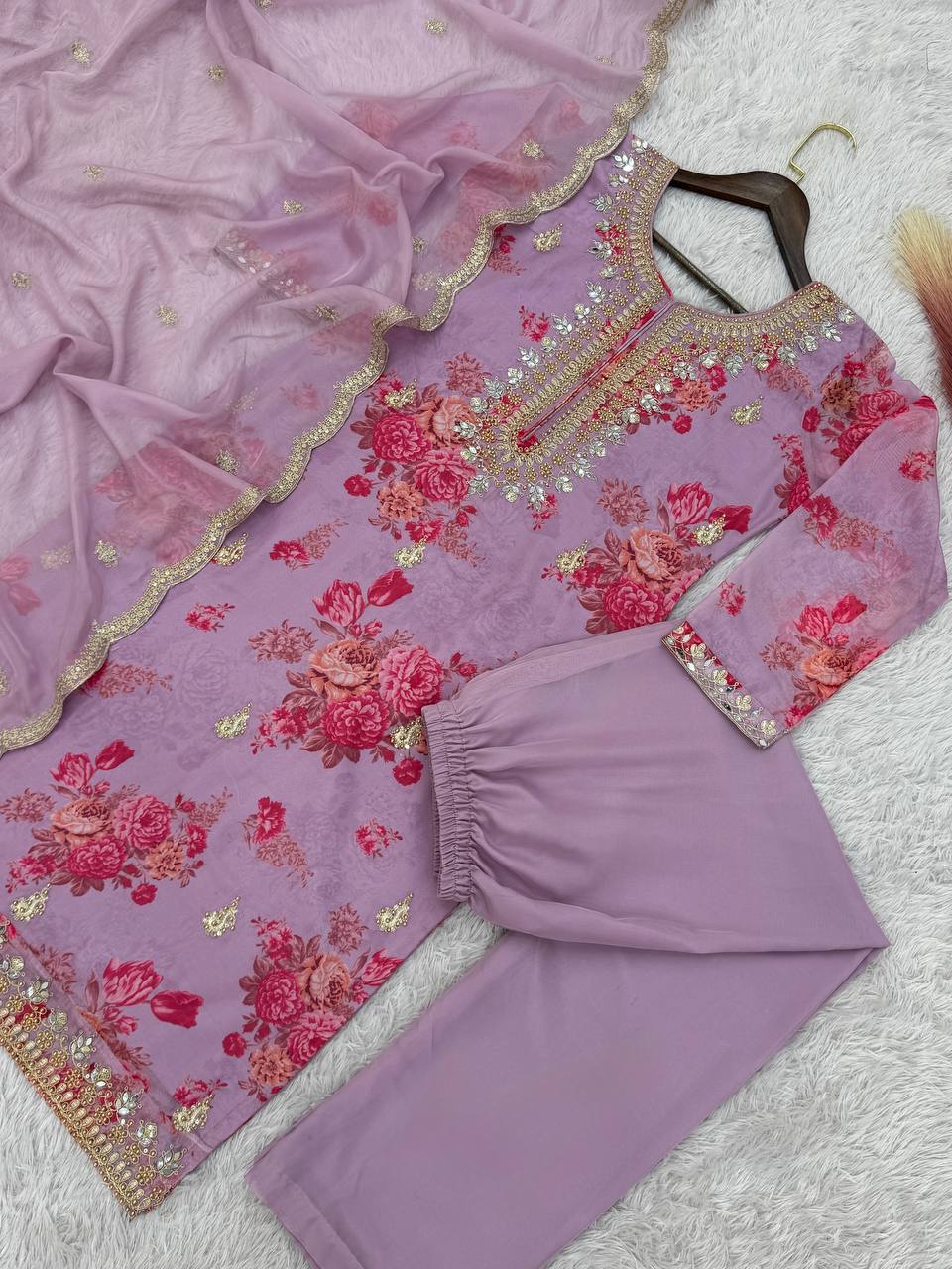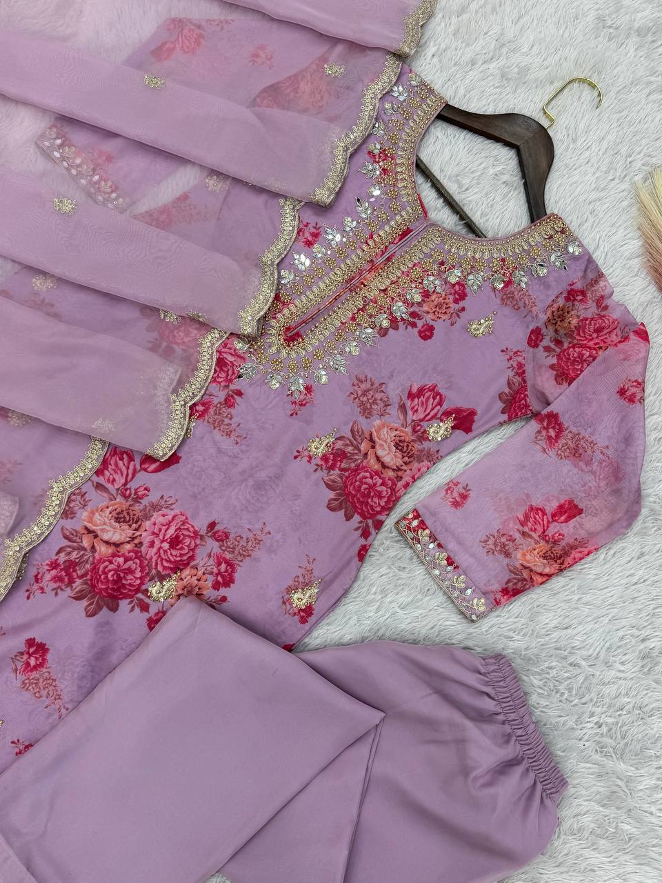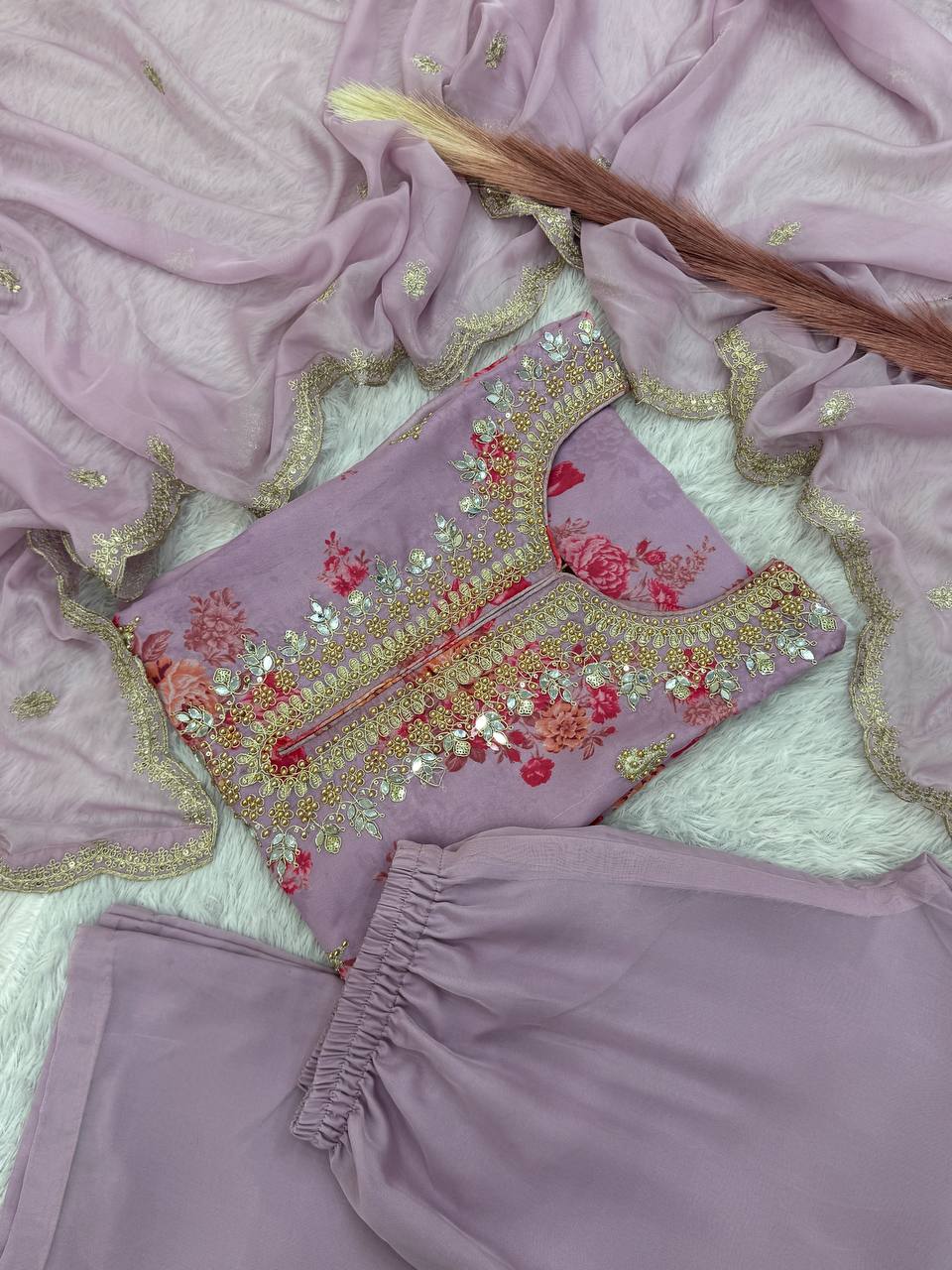 Party Wear Mauve Pink Kundan Organza Suit With Embroidery Coding Dori-Sequence Worked