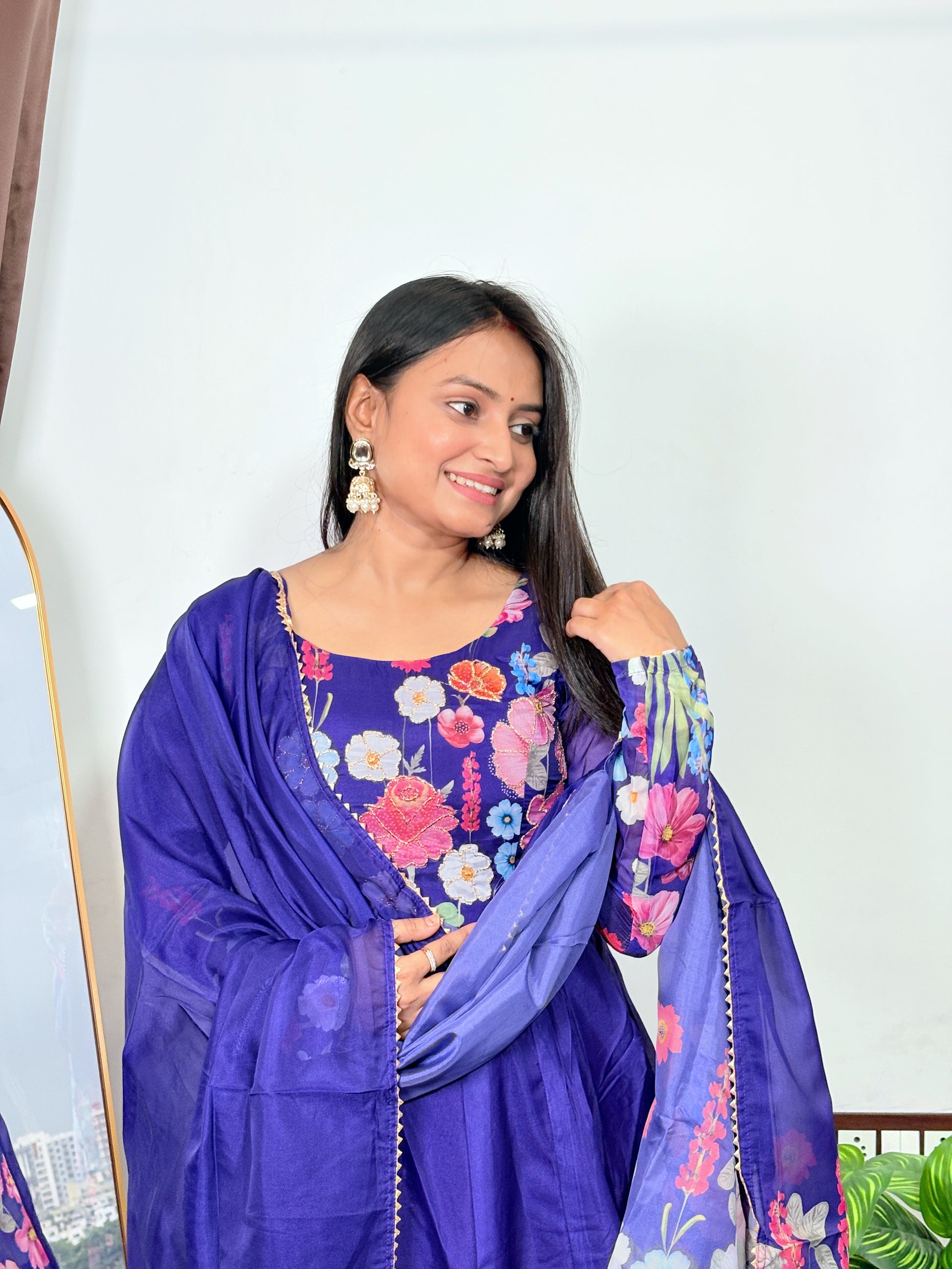 Women’s Royal Purple Floral Printed Anarkali Suit Set with Dupatta Elegant Ethnic Wear for Parties Weddings & Festivals