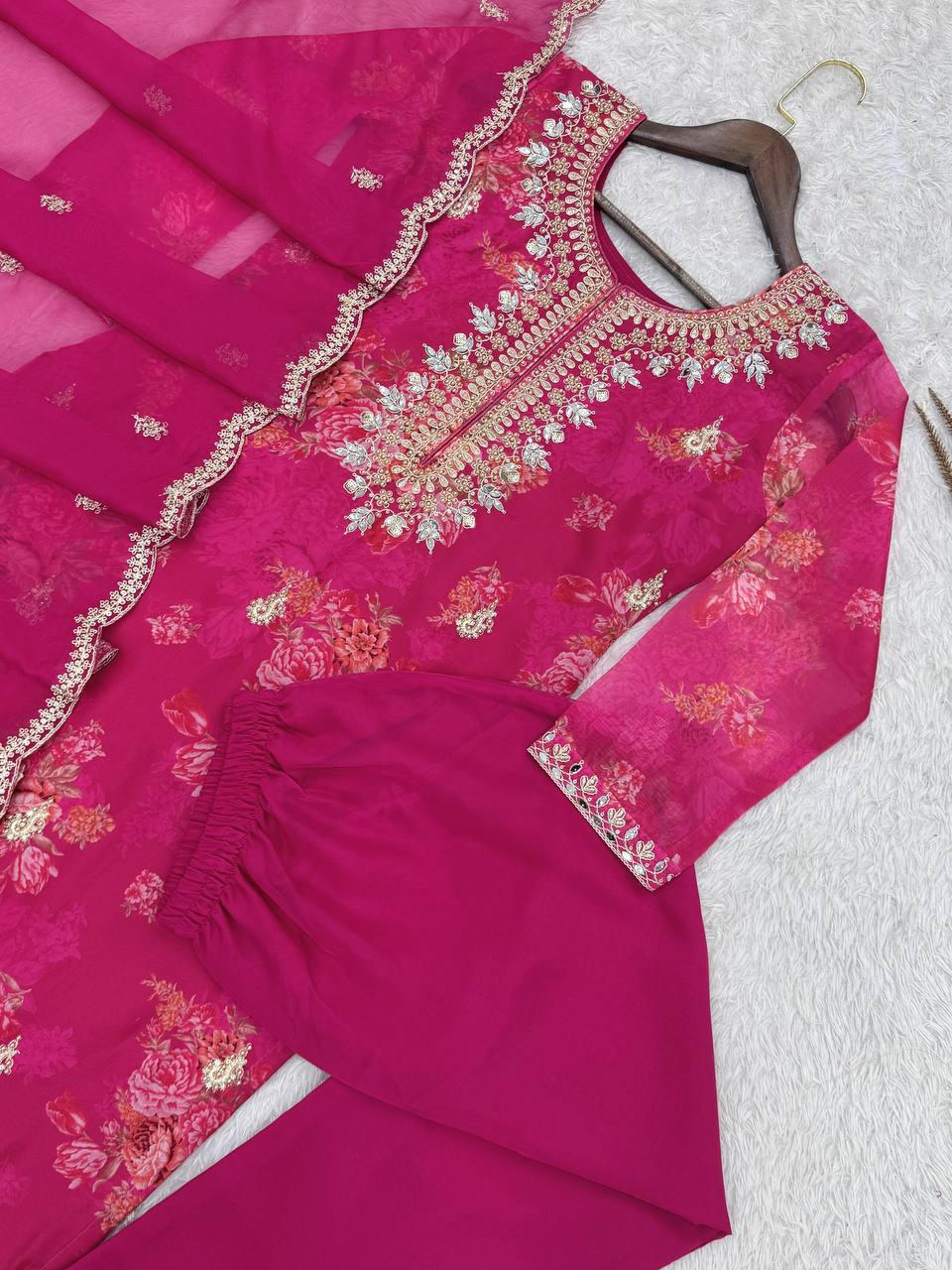 Party Wear Dark Pink Kundan Organza Suit With Embroidery Coding Dori-Sequence Worked