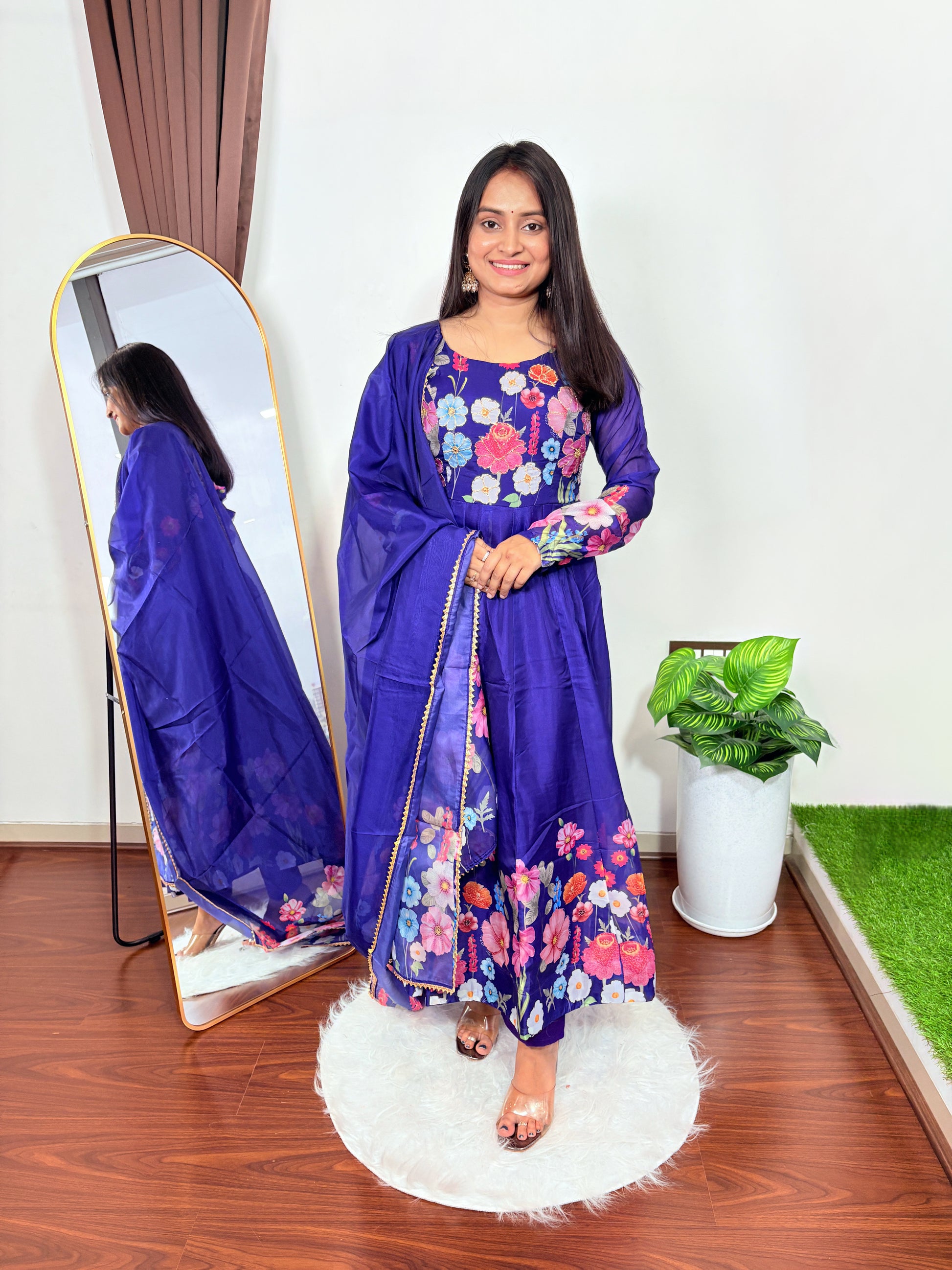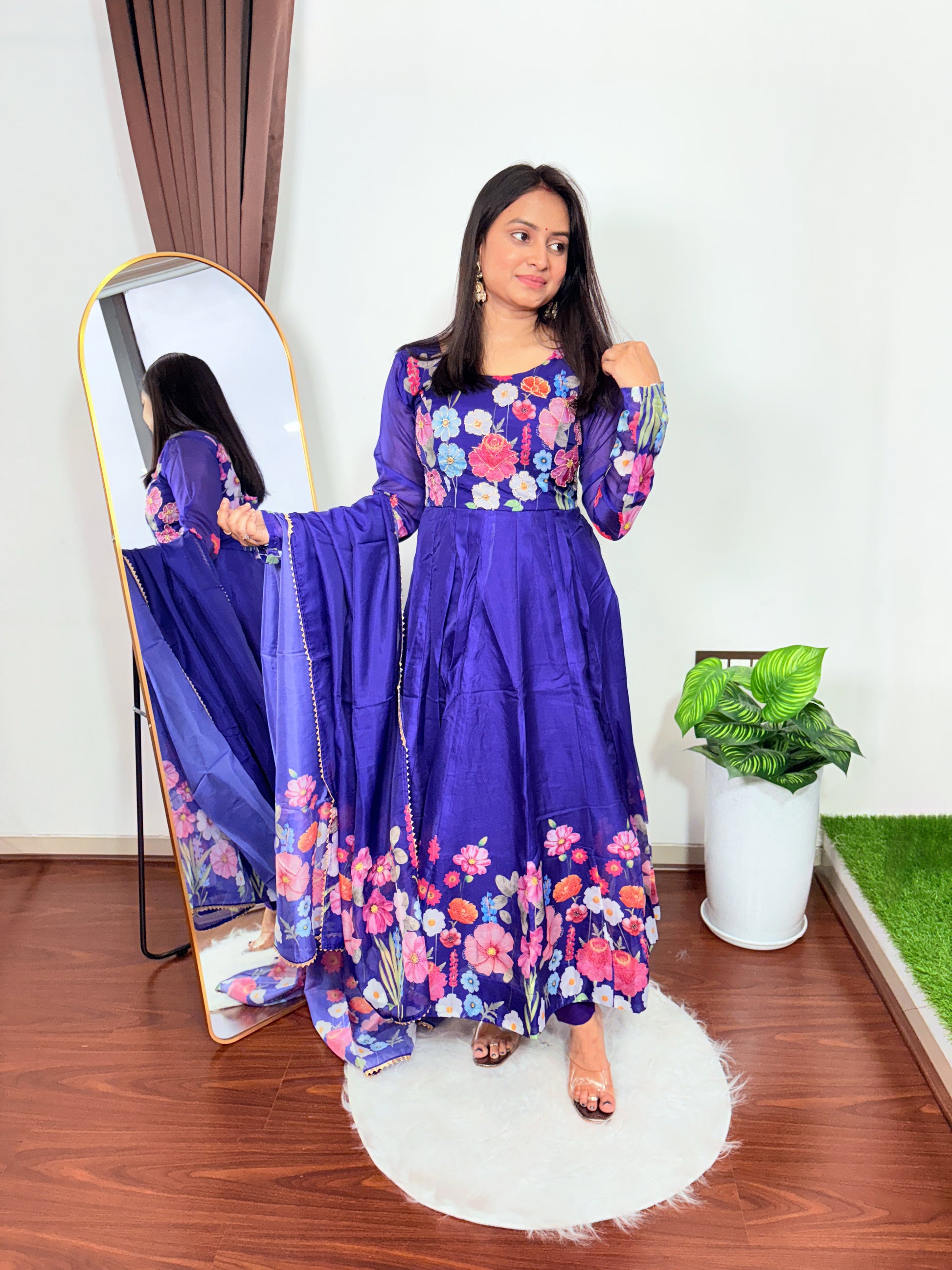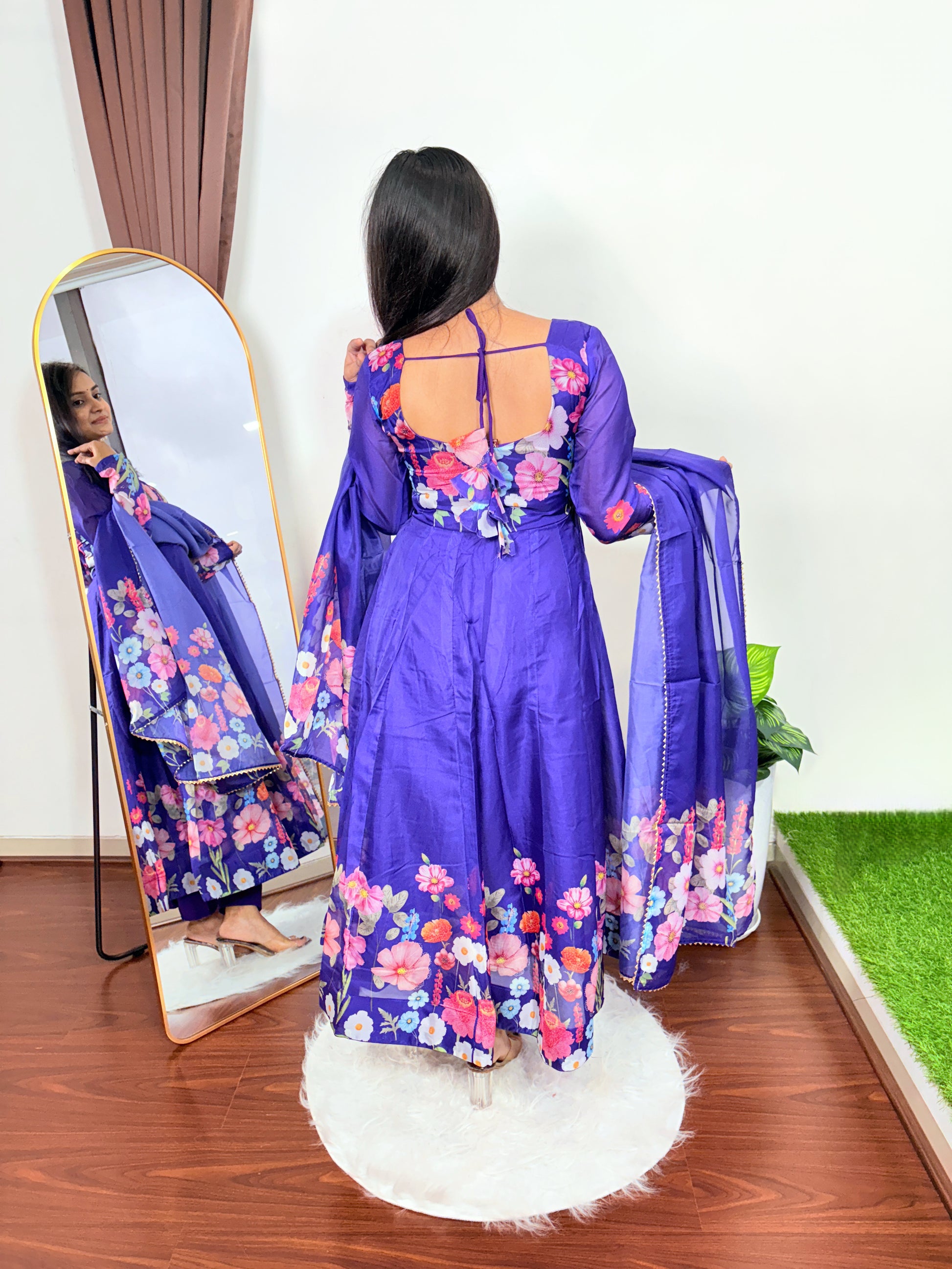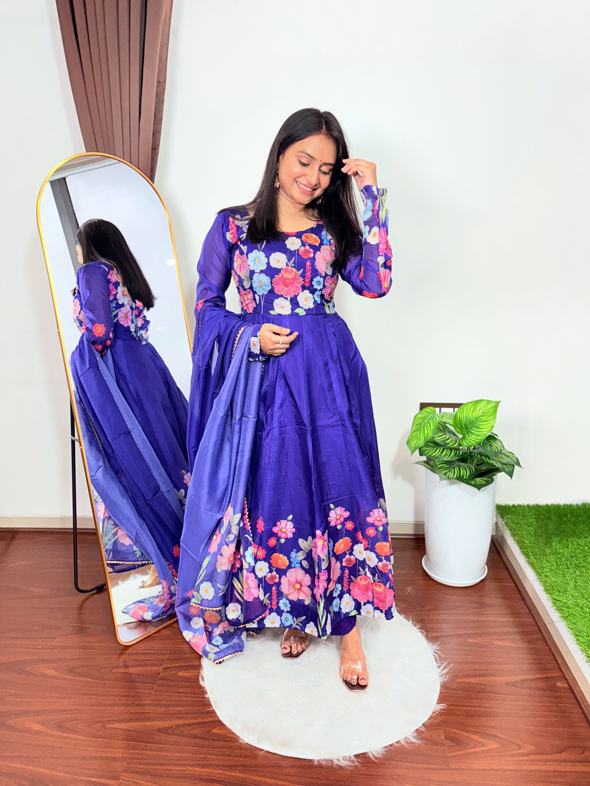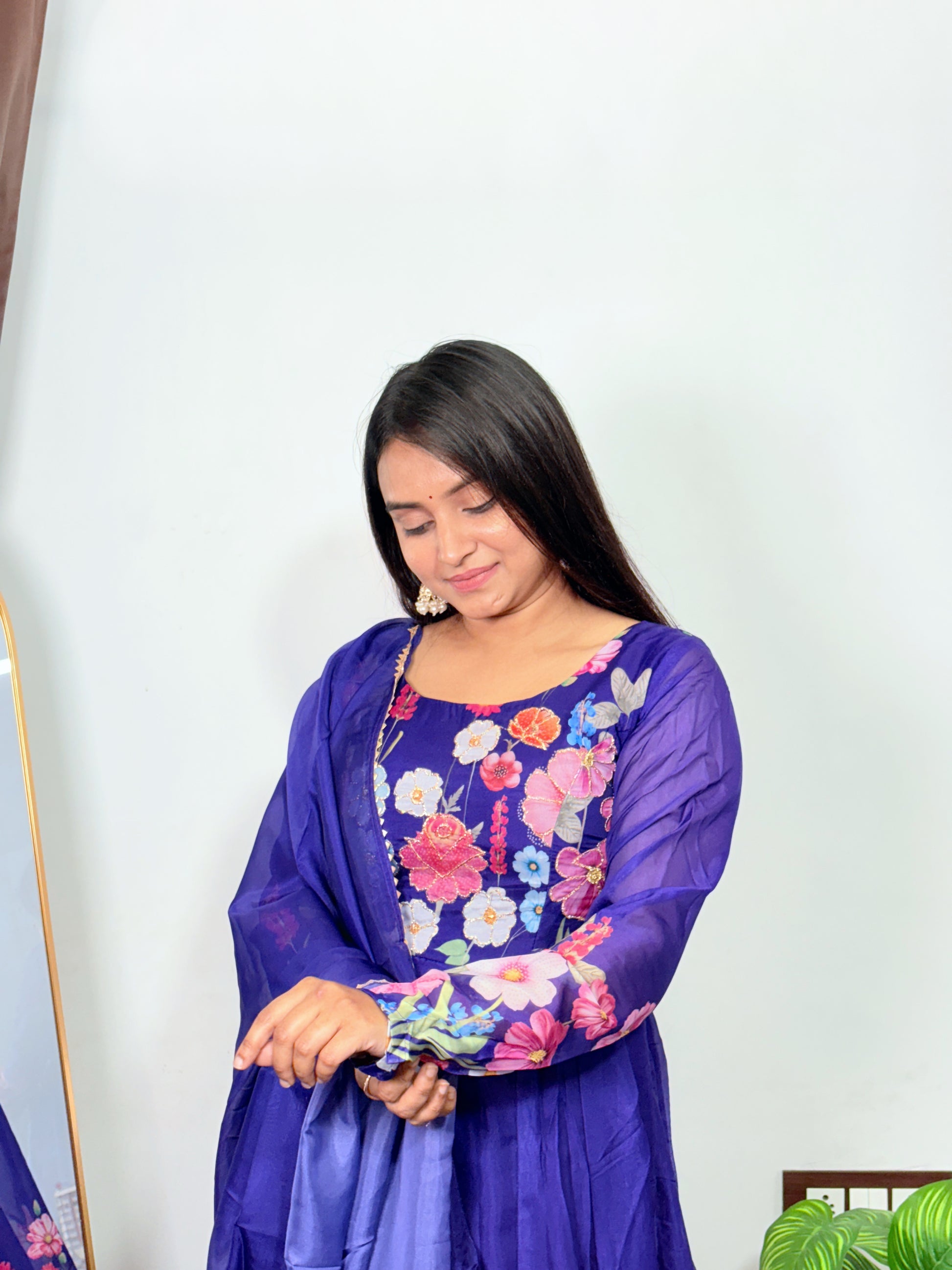Women’s Royal Purple Floral Printed Anarkali Suit Set with Dupatta  Elegant Ethnic Wear for Parties Weddings & Festivals