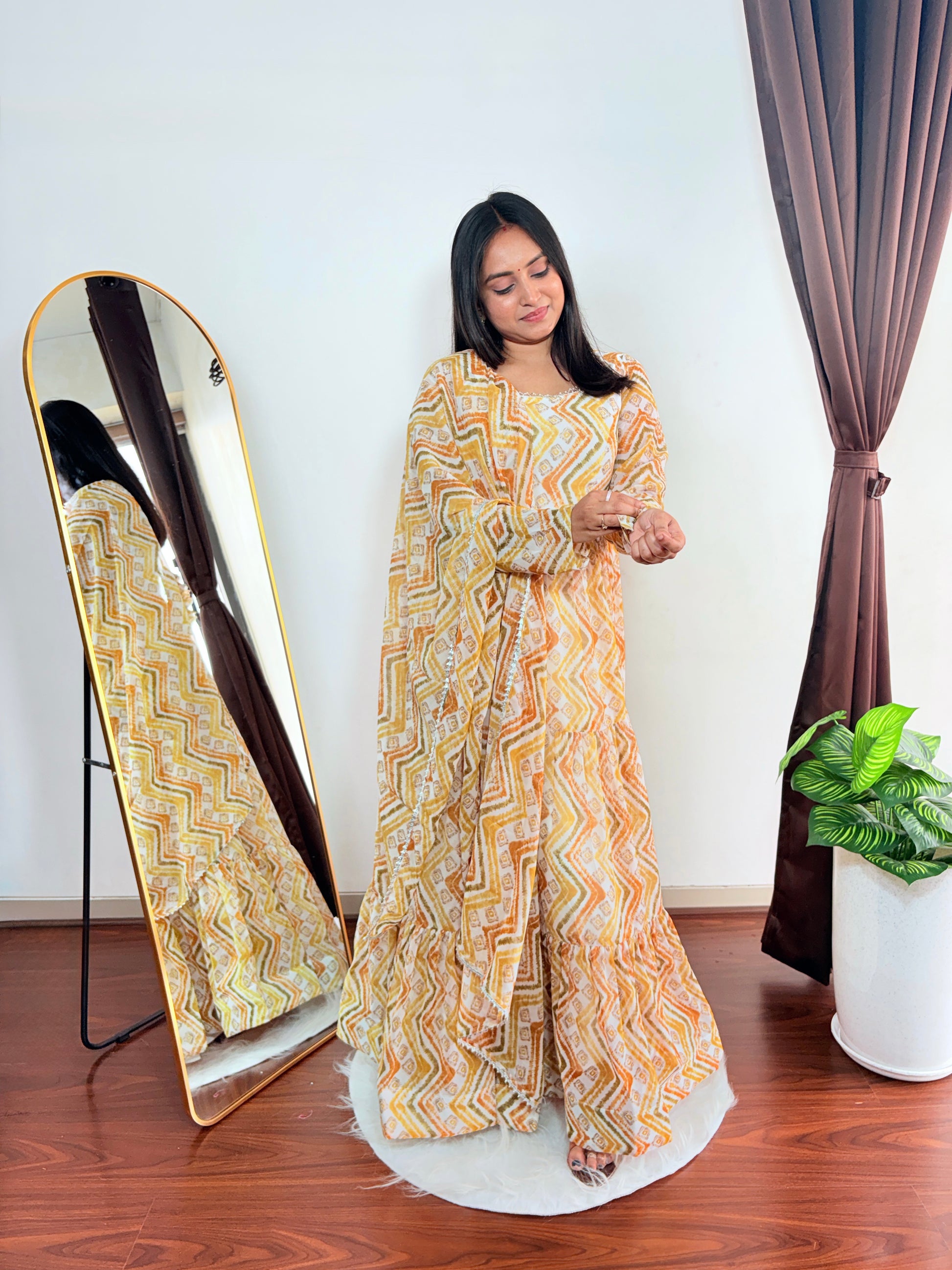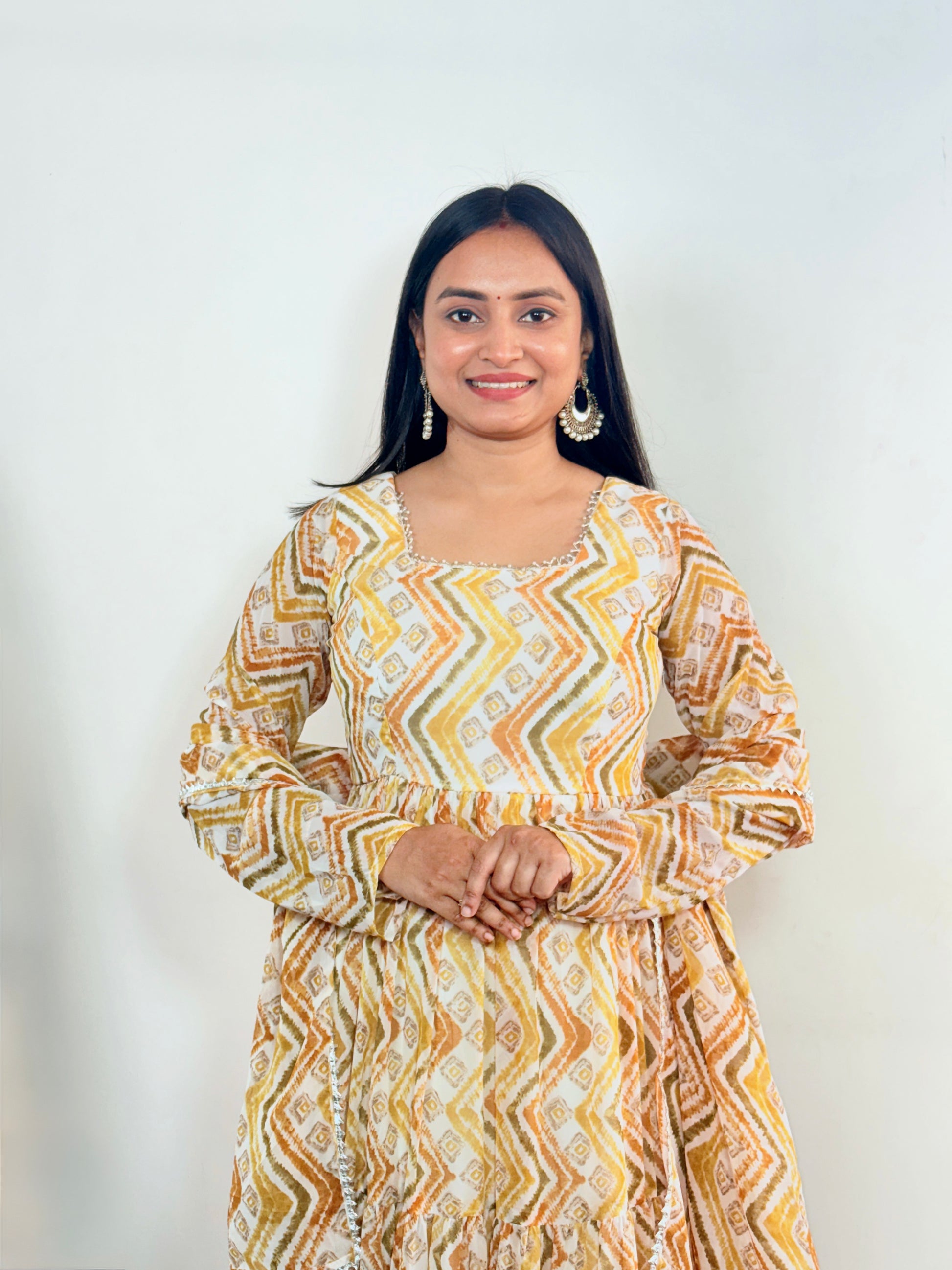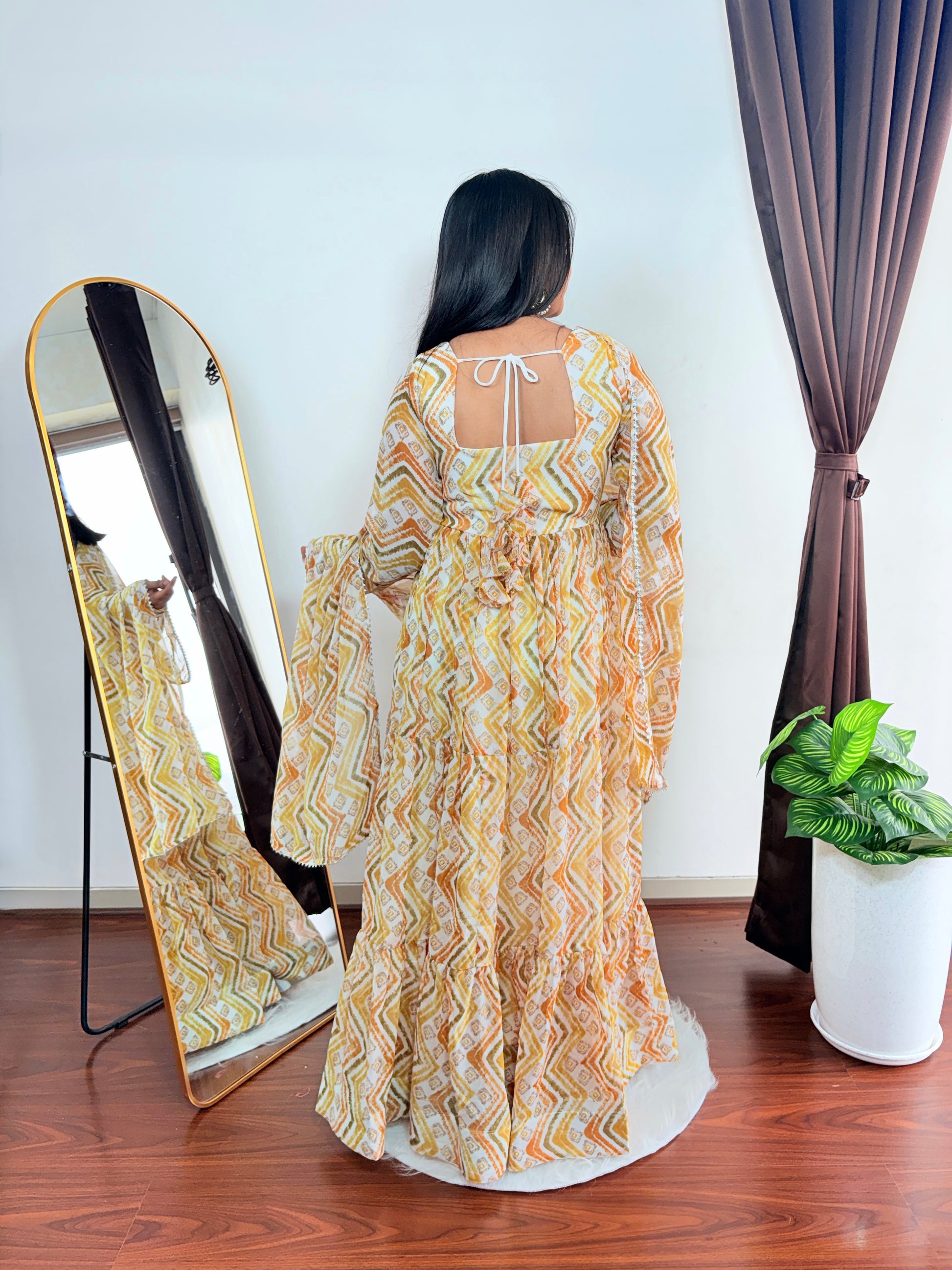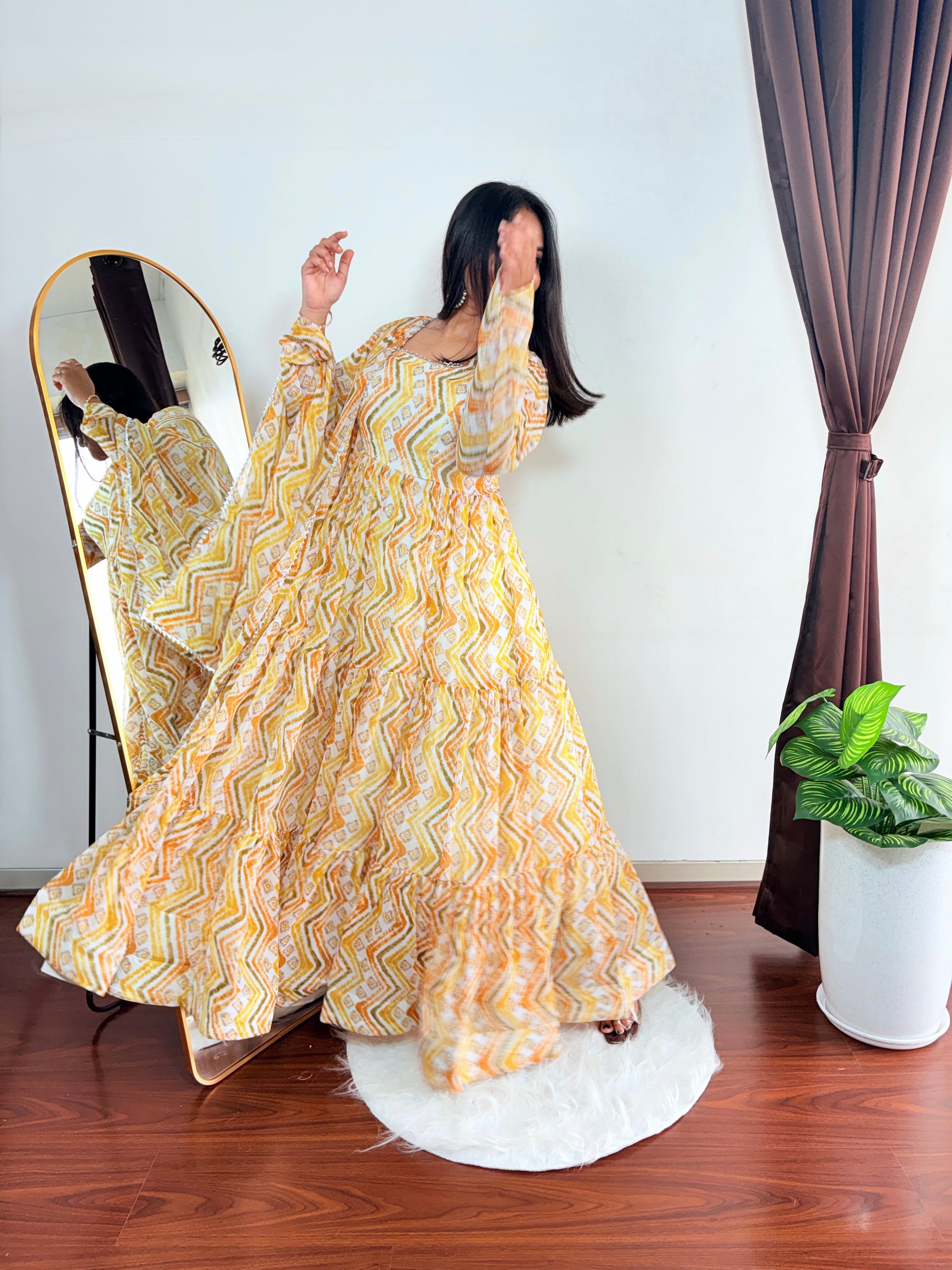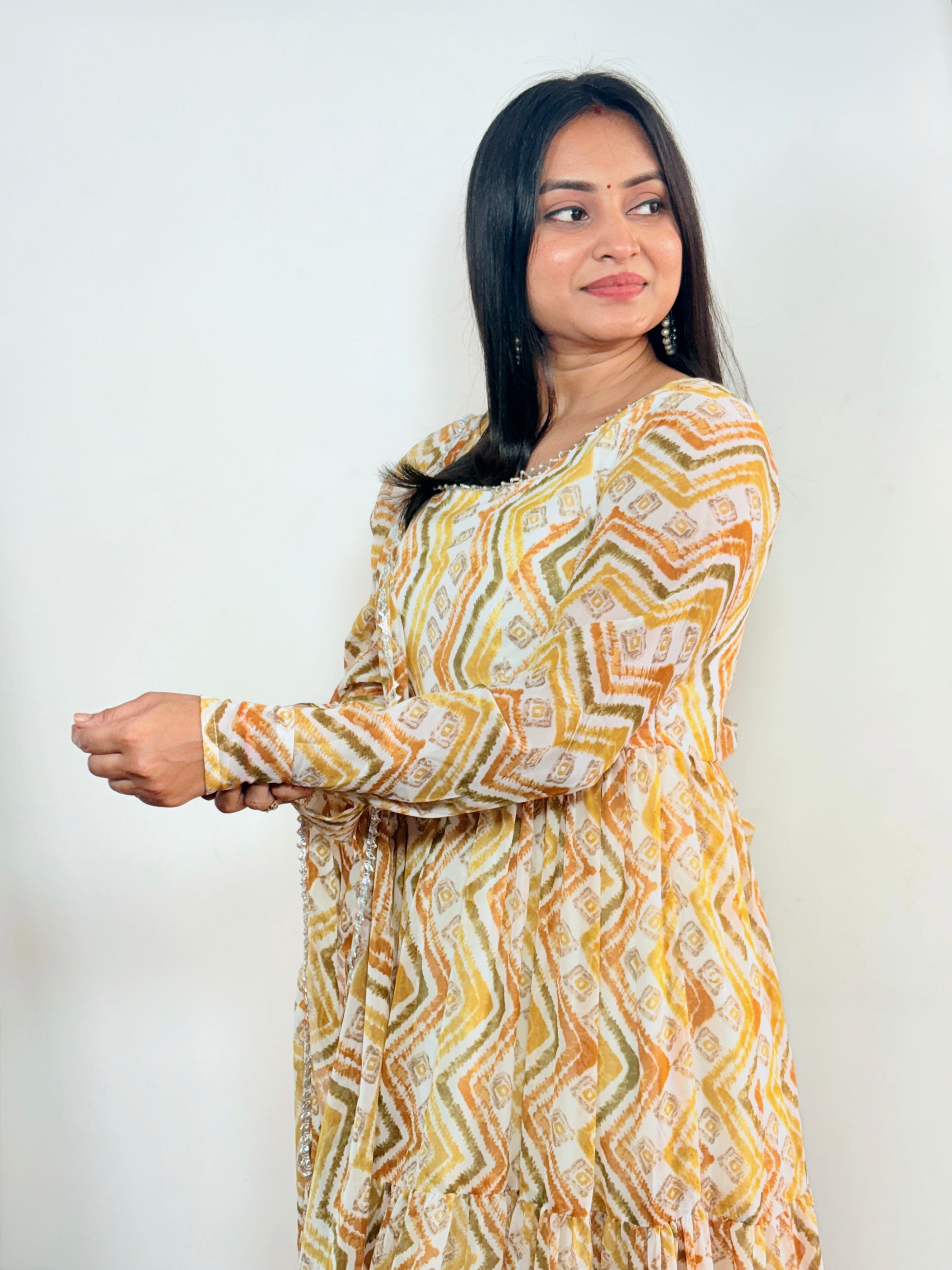 Yellow & White Printed Long Kurti for Women Stylish Ethnic Wear with Zigzag Pattern & Flared Design