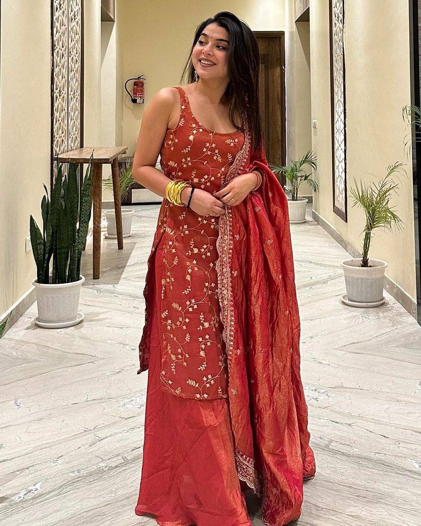 Designer Party Wear Organza Orange Color Plazzo Suit Set