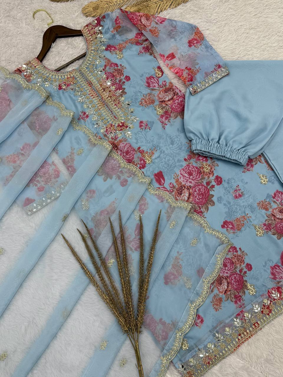 Party Wear Sky Blue Kundan Organza Suit With Embroidery Coding Dori-Sequence Worked