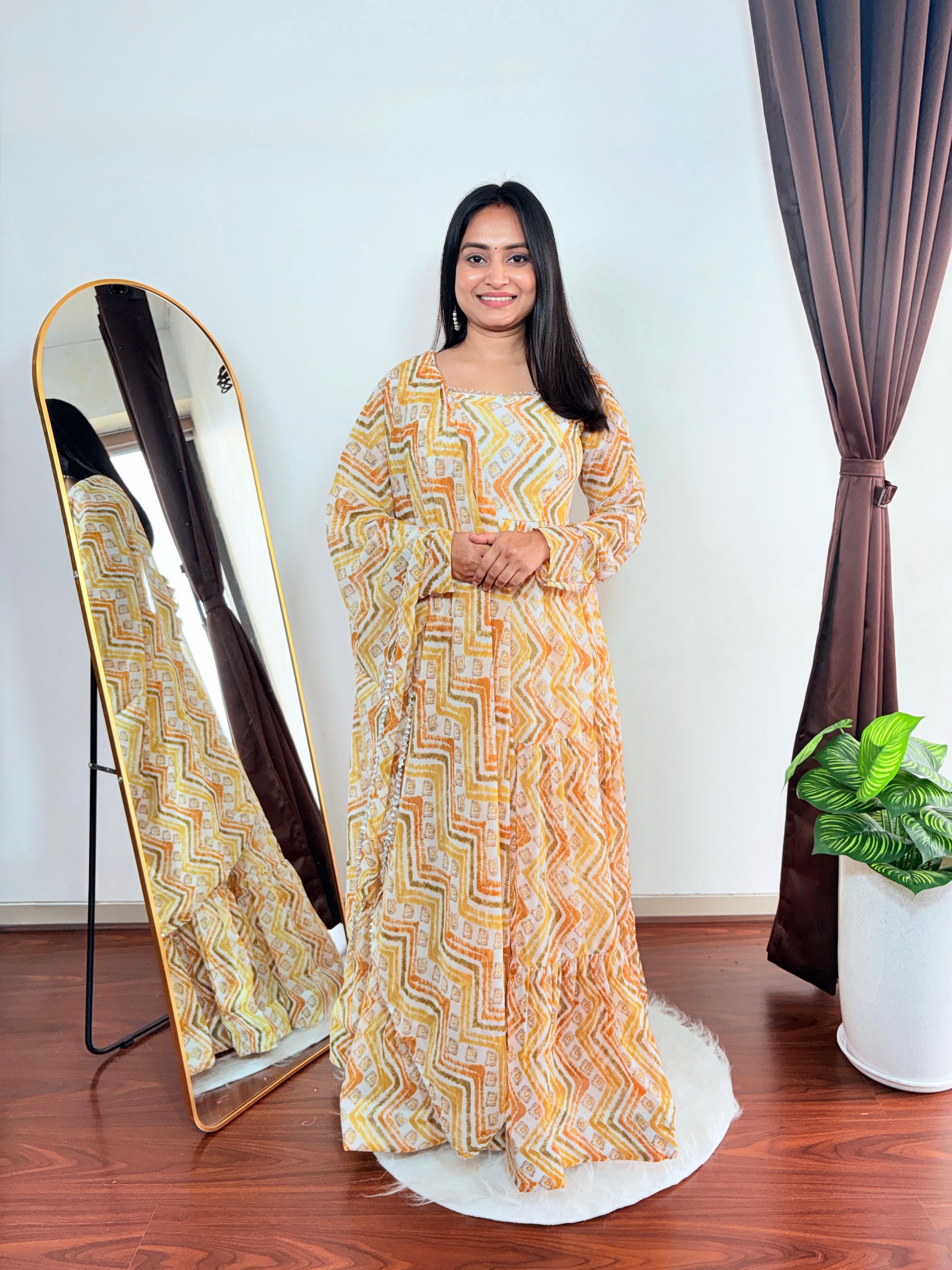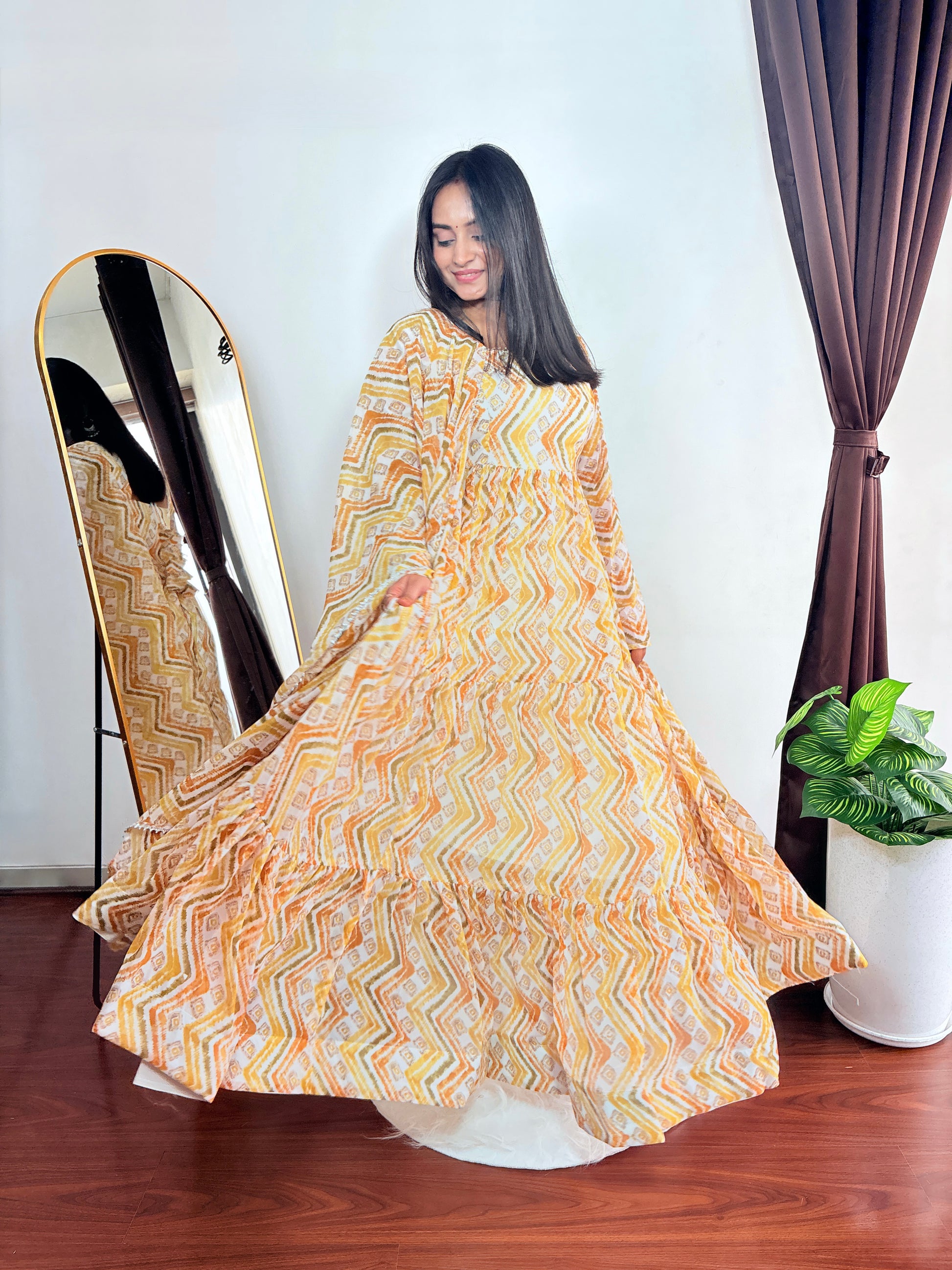 Yellow & White Printed Long Kurti for Women Stylish Ethnic Wear with Zigzag Pattern & Flared Design